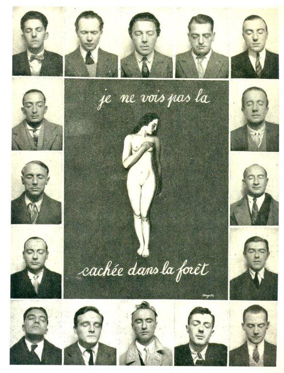 Fig. 8. Photomontage published in the last issue of La Révolution surréaliste, no. 12, December 15, 1929, illustrated with a series of passport-sized photographs, taken by Man Ray, of members of the Surrealist Group around the likewise photographic reproduction of a painting by René Magritte, The Woman Hidden [La Femme cachée], 1929. Magritte’s painting incorporates a phrase in which the word “femme” is replaced by the image of the naked woman. What do the Surrealists see with their eyes closed?
