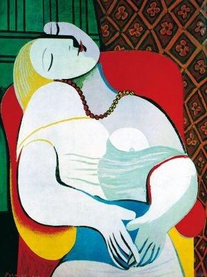 This image of Marie-Thérèse Walter, a representation of the plenitude of the erotic desire of Picasso, this portrait with its riven face, with the body openly showing itself, is in reality a mirror. A pictorial mirror that returns the gaze of he who is really dreaming: Picasso himself, that voyeur, an obsessive ogler, here absent, but who repeatedly lets us see him contemplating, with greater or lesser excitement, women who seem to sleep for his eyes alone. Picasso and his desire, caught here not by the tail of words but by the brilliance of the dream, dwell in this painting, which is, if not strictly speaking on the Surrealist continent, then very, very close to it.