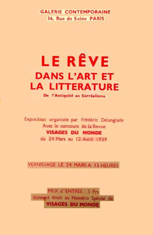 In addition to this important document, in 1939 the painter Frédéric Delanglade, who had become a member of the Surrealist Group in 1933, organized, at the Galerie Contemporaine in Paris, an exhibition called Le Rêve dans l’art et la littérature, de l’antiquité au surréalisme [The dream in art and literature, from antiquity to Surrealism], which was open to the public from March 24 to April 12. The exhibition had the support of the monthly magazine Visages du monde [Faces of the world], which on March 15 published a number of the same name [fig. 6].